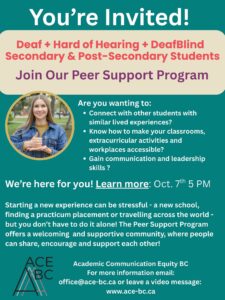 Are you planning on going to post-secondary or currently attending a post-secondary institution in BC? Are you Deaf, hard of hearing, or DeafBlind? ACE-BC knows that preparing or adjusting to post-secondary life can be a lot to deal with. You will become an equal partner in your education. As an independent learner, you will be responsible for your learning decisions and planning. The accessibility services coordinator at your school can help you with the process, but don’t wait! Make an appointment with the Accessibility servicesat least three or four months before you are to begin your studies, to ensure plenty of time to plan for your educational decisions, funding options, access to adaptive technology and arrange service providers.