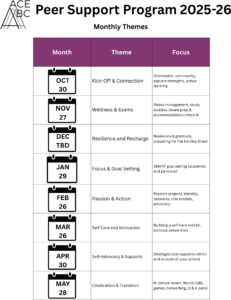 Monthly meetings: Focused on transition topics like accommodations, self-advocacy, and wellness. Guest presentations from the community and activities lead by Peer Supporters.